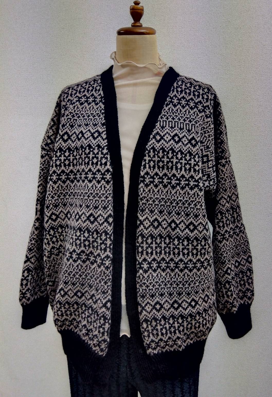 編み込みのカーディガン、細かい編み込みなのでとても大変だったと思います。とてもシックな色合いで、何にでも合わせられそうなカーディガンが完成しました。