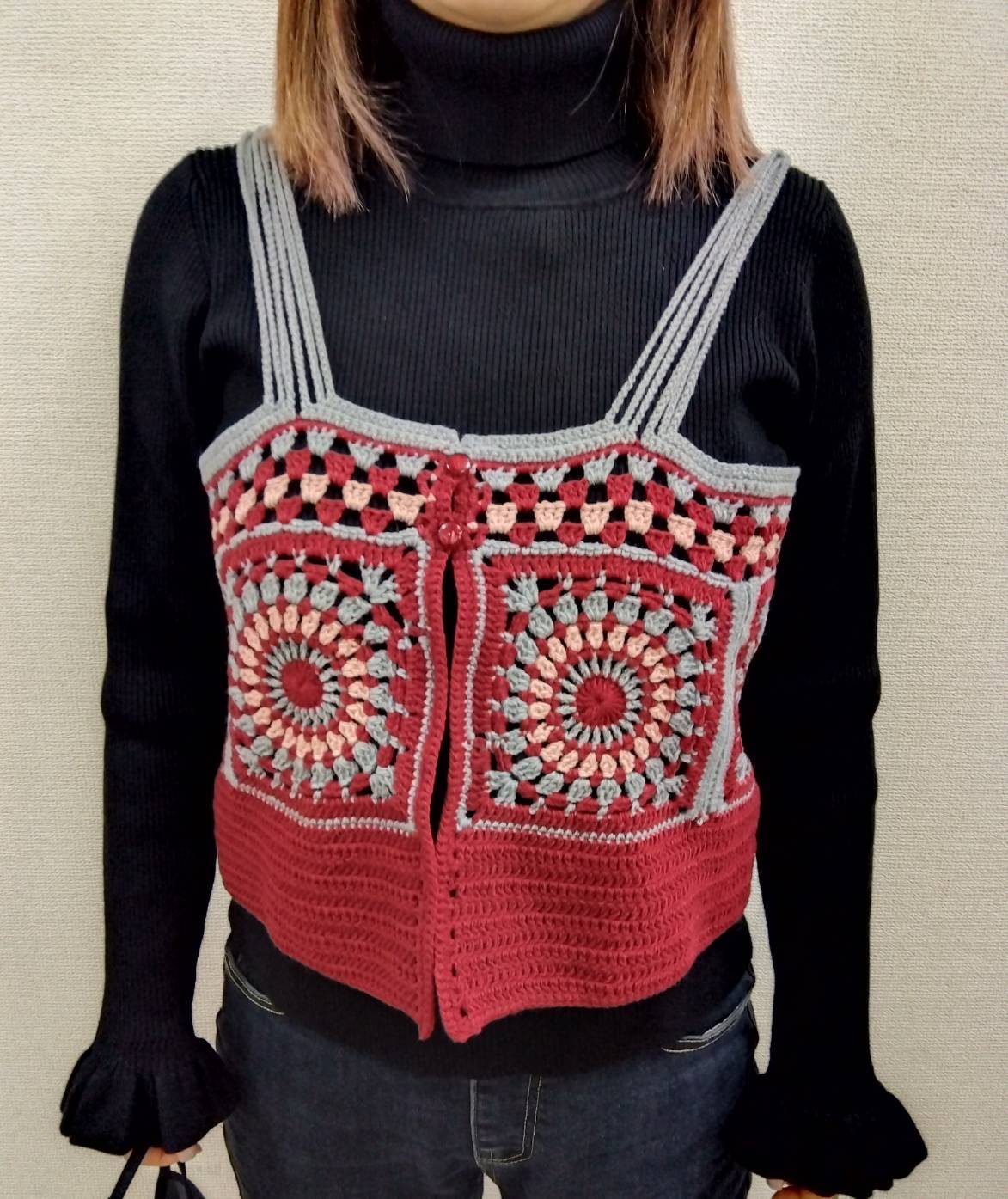 モチーフ編みをつなげたとても細かい作業のベストが完成しました👏👏👏 ジャケットの中から覗くモチーフ模様がとても素敵そうですね。これから大活躍です。